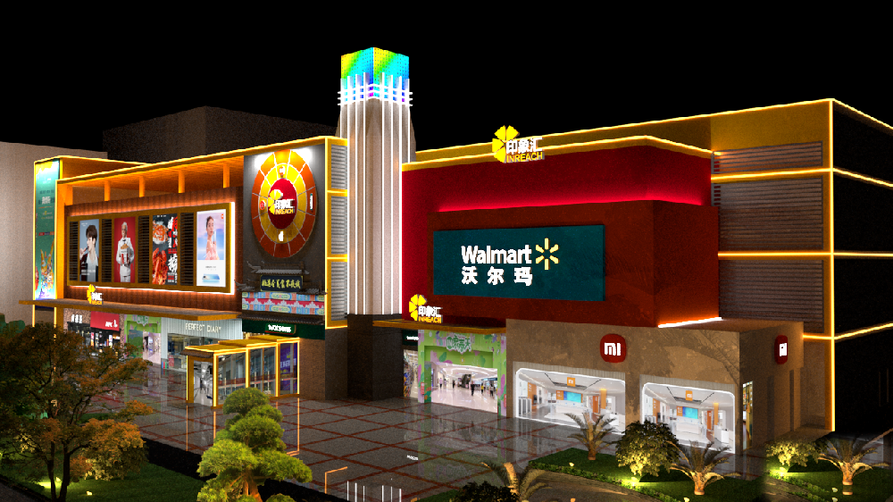 在具體方案中,設(shè)計團隊采用 "分層布光、主次呼應" 的策略:建筑主立面以 3000K 暖白光洗墻燈為基礎(chǔ),通過精準的光束角控制,勾勒出簡潔大氣的建筑輪廓,既凸顯了現(xiàn)代商業(yè)建筑的利落線條,又與沃爾瑪超市的溫馨消費氛圍相適配;裙樓部分則創(chuàng)新采用暗藏式 LED 線條燈,沿商鋪招牌的邊緣有序排布,在夜間形成連貫的光影燈帶,既保證了商鋪標識的清晰呈現(xiàn),又避免了強光對行人的視覺干擾。這種設(shè)計既尊重了建筑原有結(jié)構(gòu),又通過燈光層次的變化,讓建筑在夜色中呈現(xiàn)出 "遠觀有輪廓,近賞有細節(jié)" 的視覺效果。