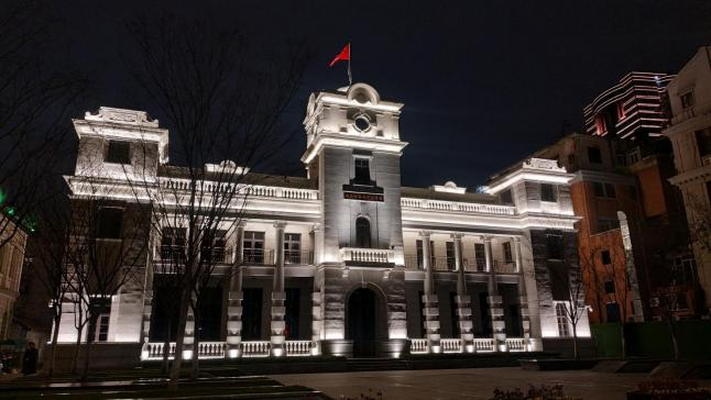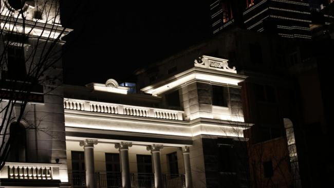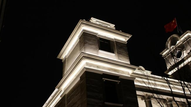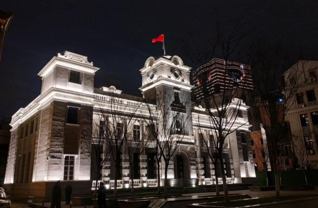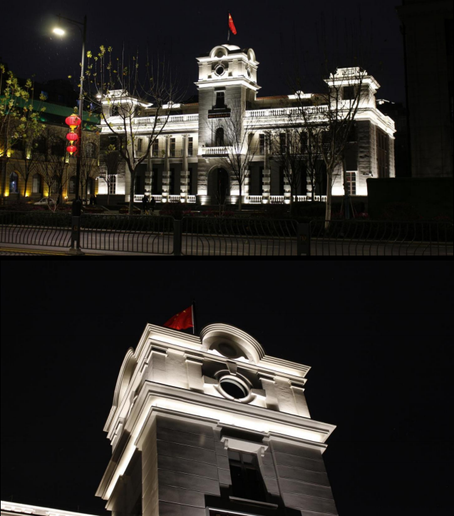 根據(jù)建筑自身特點,燈光布局明暗有序,層次分明,整體采用大面積泛光照明的手法,局部細(xì)節(jié)采用重點照明的手法,突出建筑細(xì)部節(jié)點構(gòu)造,體現(xiàn)建筑獨特的美感。光影由下至上,層次豐富。樓頂?shù)奈逍羌t旗高高飄揚,在夜間燈光的輔助下,形成視覺焦點,光彩奪目,莊重神圣。